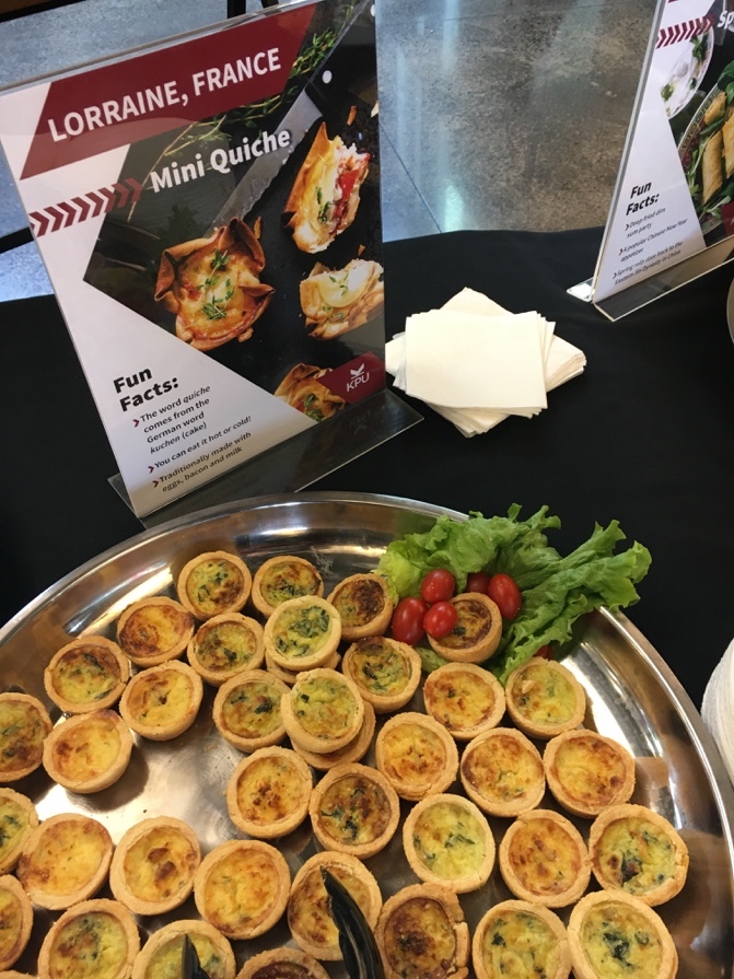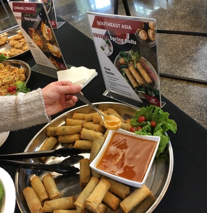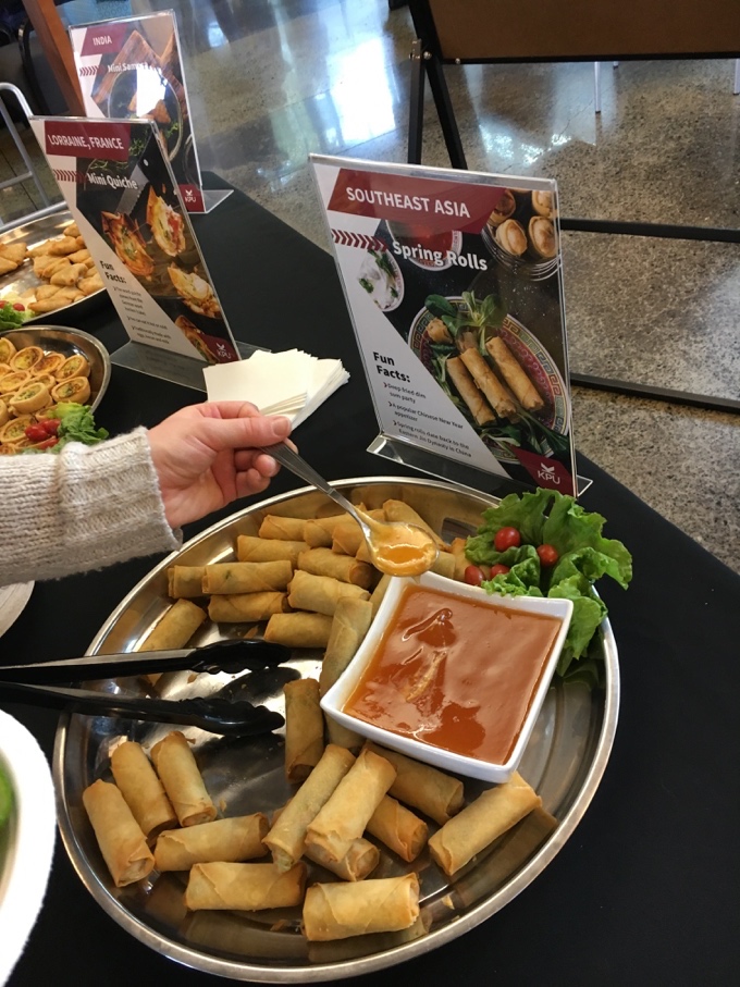 During the International Focus Week, Sodexo was in charge of serving food from various countries. All the KPU community had the chance to try nachos from Mexico, hummus from the Middle East, salad rolls made with rice paper from Vietnam, spanakopita from Greece, quiches from France, spring rolls from Southeast Asia and samosas from India. The dessert menu included cheesecake, representing American food, and tiramisu from Italy. Asked about what was the most difficult recipe to prepare, Sanghera is pretty straightforward: “The Vietnamese one, definitely! The rice paper takes about two hours to elaborate and the vegetables need to be cut in a specific way that also takes time. But it is delicious.”
